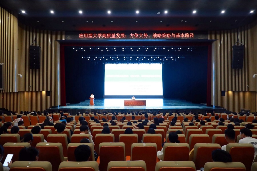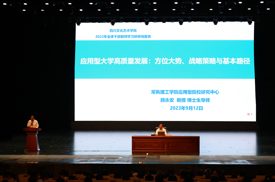 为进一步统一思想、提高认识,引导全校教职员工深刻理解、准确把握应用型本科教育理念,全面推动学校内涵建设和高质量发展,9月12日下午,四川文化艺术学院邀请常熟理工学院应用型院校研究中心主任顾永安教授莅临梓潼校区文昌剧院,举办了一场以“应用型大学高质量发展:方位大势,战略策略与基本路径”为题的专题讲座。学校党委书记、督导专员左冬梅,常务副校长梁秀梅,党委副书记、纪委书记兼工会主席刘立新,副校长罗建光,学术委员会主任黄金中,艺术委员会主任朱智忠,各职能部门相关负责人,各二级学院领导班子及教师代表到场聆听了讲座。讲座由学术委员会主任黄金中主持。