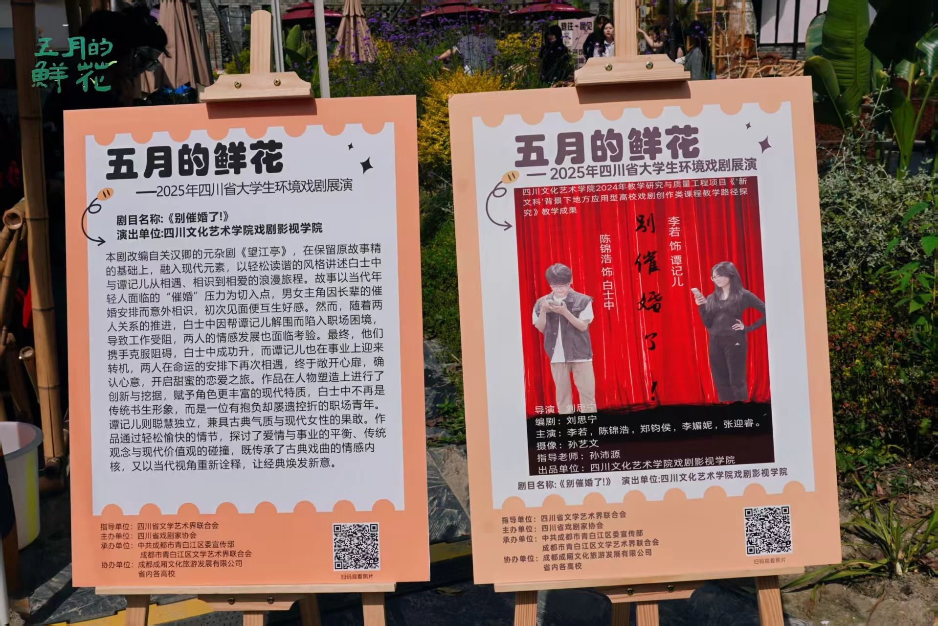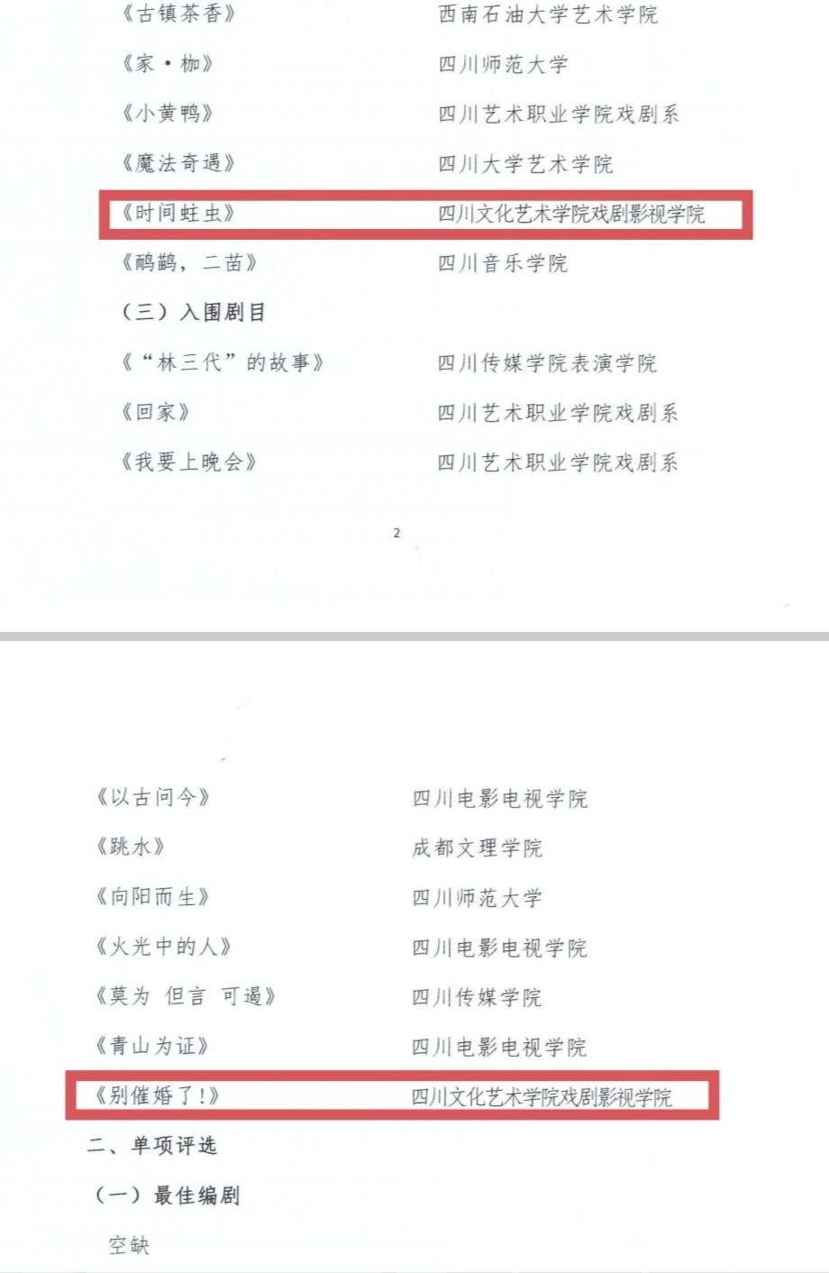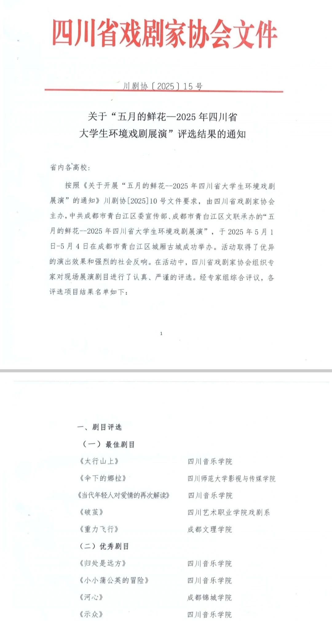 我校戏剧影视学院戏剧学专业、表演专业学生在专业教师孙沛源、徐舸、赵杉杉的指导下,创编并演出的《时间蛀虫》《别催婚了!》在“五月的鲜花--2025年四川省大学生环境戏剧展演”活动中荣获“优秀剧目”和“入围剧目”。