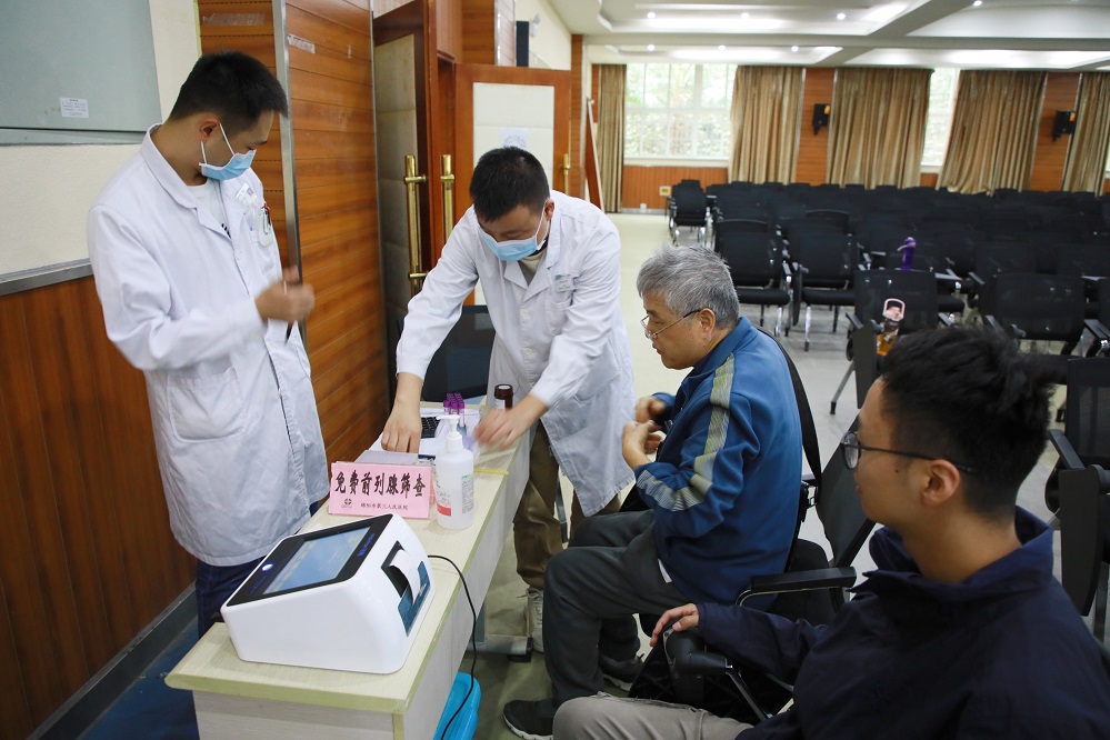 讲座结束后,眼科、内分泌科、甲状腺外科等科室专家为参加讲座的教职工提供了甲状腺彩超检查、前列腺癌筛查、眼科常见疾病筛查等免费义诊服务。义诊医生们细致地为大家进行健康查体,耐心解答各种健康问题,并根据不同体质和健康状态,科学的提供了疾病防治等意见。