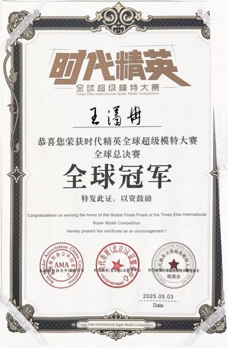 在礼服环节,王潇冉同学以一袭融合现代美学与东方韵味的礼服斩获“全球冠军”。她的演绎刚柔并济,将传统文化与时尚潮流巧妙融合,在舞台上释放出独特魅力,征服了国际评委团。
