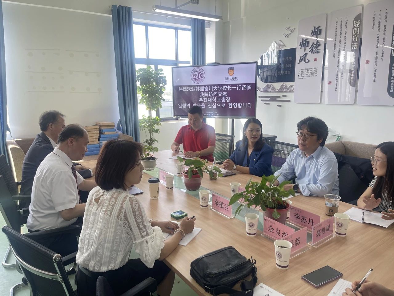 上午10时,座谈会在绵阳校区行政楼四楼会议室隆重举行。富川大学代表团韩政锡校长、规划创新处处长崔埈赫、国际交流院院长金模兰、影像设计系主任金良洙等学科领域负责人出席此次会议;四川文化艺术学院执行校长梁秀梅携国际交流学院、教学科研管理部、外事办公室等部门出席。