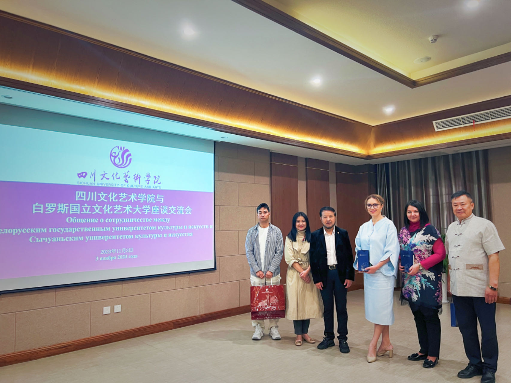 2023年11月3日,四川文化艺术学院与白俄罗斯国立文化艺术大学交流座谈会议在梓潼校区文昌学宫第五会议室举行。白俄罗斯国立文化艺术大学校长卡尔切夫斯卡娅·娜塔丽莉亚·弗拉基米罗芙娜、副校长别尔斯茨卡娅·尤利娅·德米特里耶夫娜,中白文化交流中心主任刘洋,我校副校长欧建华、合作交流部副部长敬娟、音乐舞蹈学院副院长乜伟参加了本次会议。