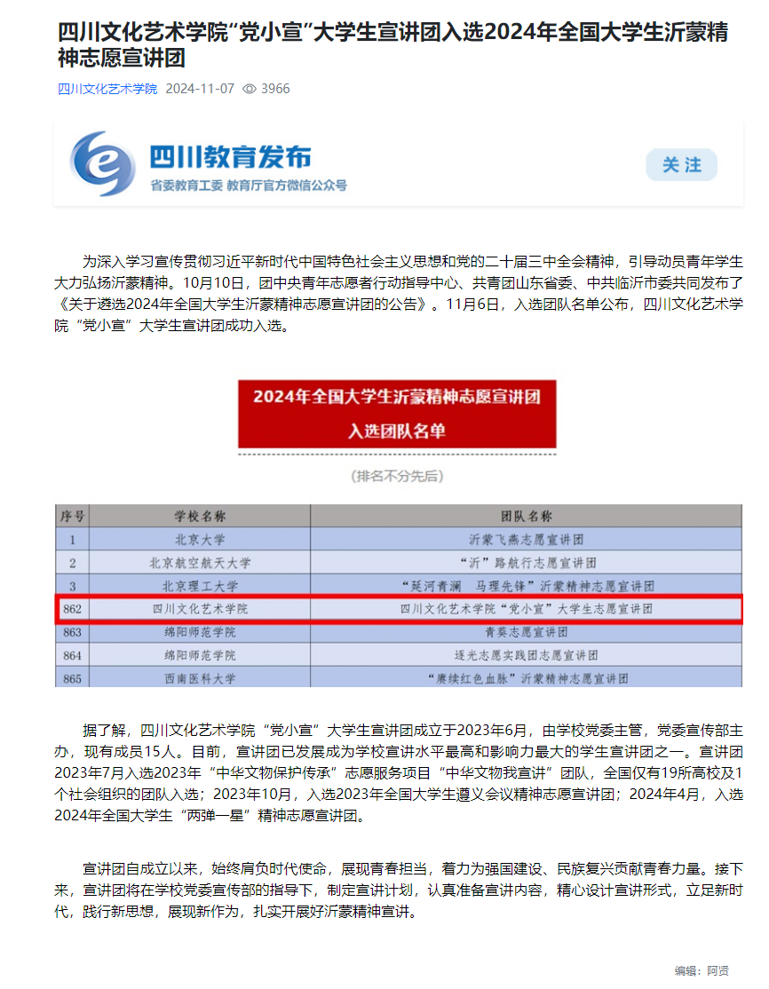 四川文化艺术学院“党小宣”大学生宣讲团入选2024年全国大学生沂蒙精神志愿宣讲团