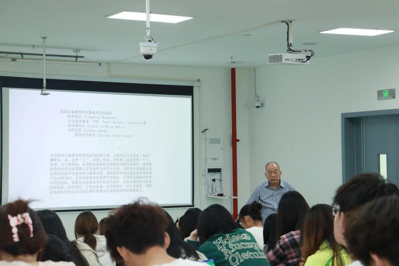 本次系列讲座,朱慰忠教授通过结合理论和实践的方式传授知识,并通过多种音频的演示,生动地向同学们展示了不同频率对声音的影响。朱教授还运用了对比分析的方法来强调音频频率在声音创作中的重要性,并探讨了在声音创作过程中如何应用音频频率以增加吸引力,讲座最后还向同学们介绍了话筒的不同类型以及音响录音工作中不可或缺的技能,包括话筒的选择与摆放、调音台的精妙使用,以及声音处理设备的功能解析。朱慰忠教授讲解方式通俗易懂,使得每一位听众都能深刻理解音响录音的核心要点。