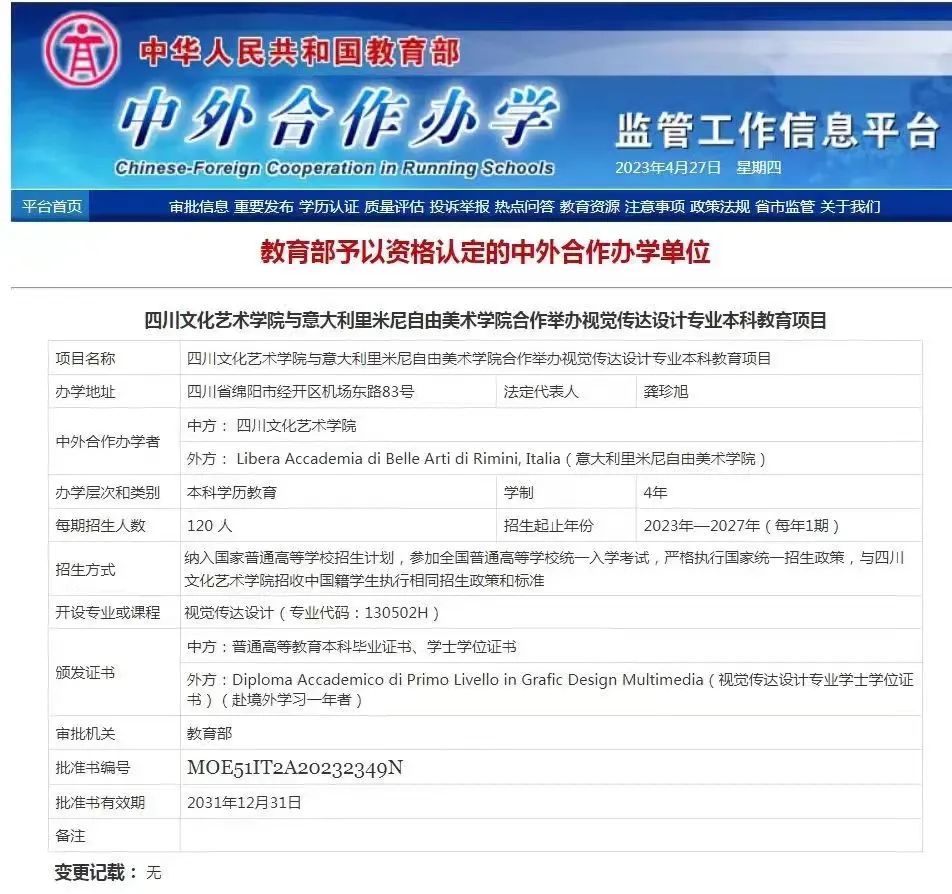 4月27日,教育部中外合作办学监管工作信息平台发布“教育部予以资格认定的中外合作办学单位”:四川文化艺术学院与意大利里米尼自由美术学院合作举办视觉传达设计专业本科教育项目获批。